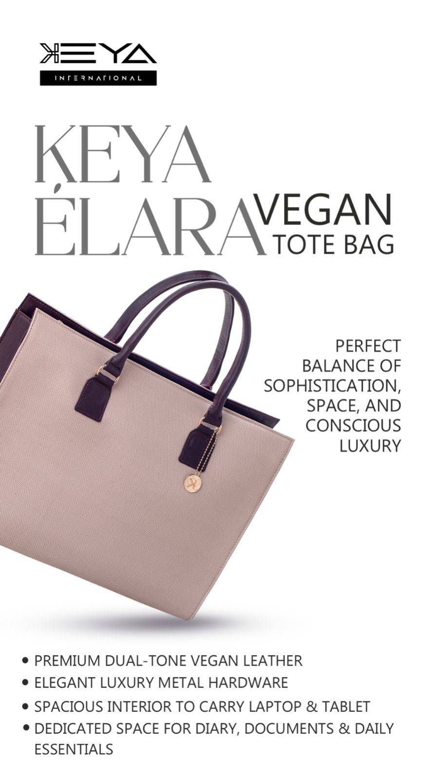 Designed for modern working women, the KEYA ÉLARA Vegan Tote blends conscious luxury with everyday functionality. Crafted from premium dual-tone vegan leather and finished with refined luxury hardware, this tote delivers a polished, professional look while offering ample space for daily essentials. The thoughtfully designed interior comfortably fits a laptop and tablet, along with your diary, documents, phone, and water bottle, making it an ideal companion for office, meetings, and daily commutes. A hidden zipper pocket keeps valuables secure, while the structured silhouette ensures easy organization without compromising elegance. Durable, lightweight, and spacious, this tote is perfect for office professionals who need style, space, and reliability in one bag.